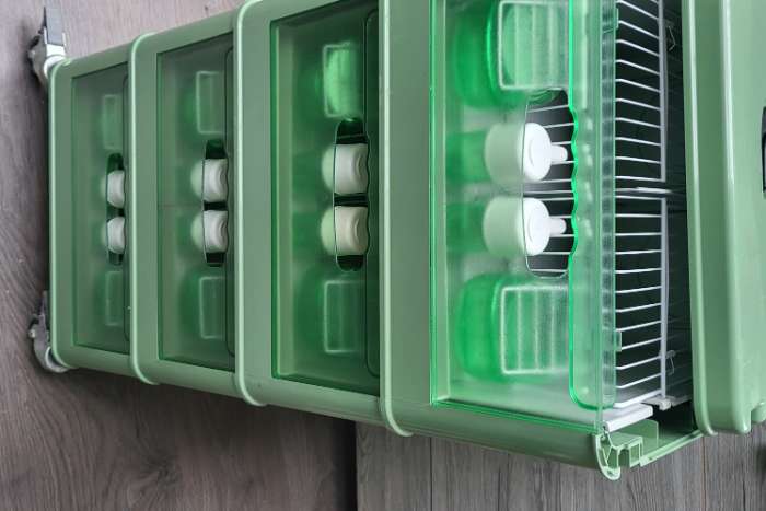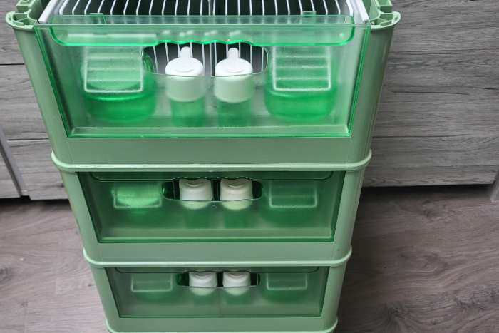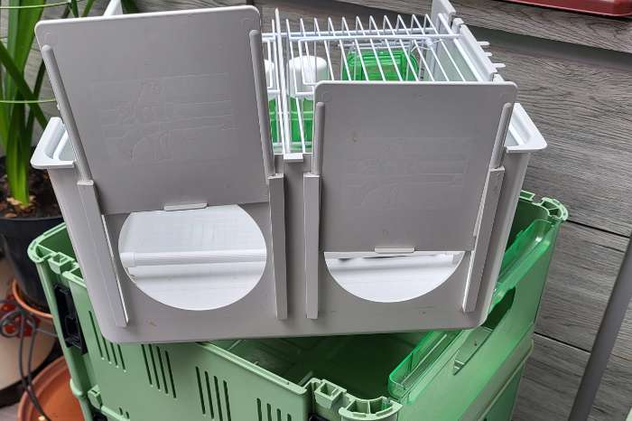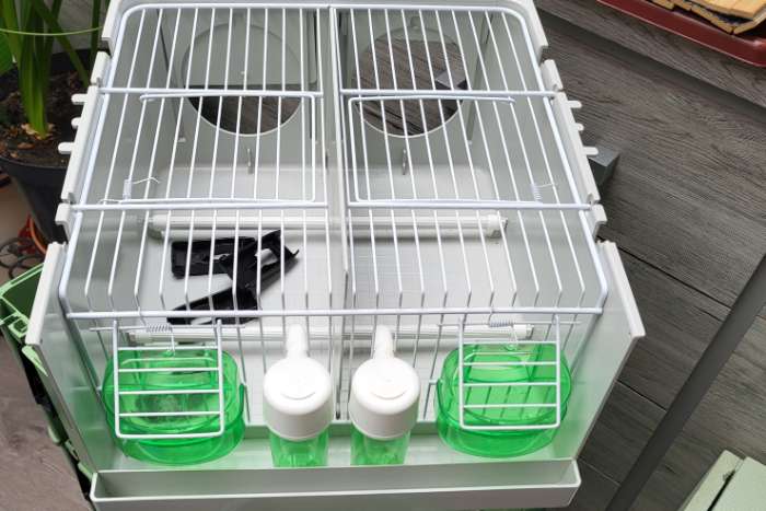 Te koop : Italiaanse transportkooi (Tino) om vogels te vervoeren naar de tentoonstellingen of beurzen . 4 op mekaar met wieltjes en 2 deksels om ze per 2 te gebruiken . Elke box is verdeeld in 2 compartimenten met telkens eet en drinkflesjes . De binnenbak kan eruit gehaald worden en daar heb je ook nog 2 schuifdeurtjes om het uitvangen te vergemakkelijken .dit is dus de duurdere uitvoering . Het is enkel maar gebruik om naar de wereldshow te gaan . Dus amper gebruikt en in nieuwstaat . Worden verkocht wegens het stoppen met tentoonstellen door gezondheidsredenen . Prijs overeen te komen .