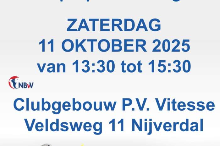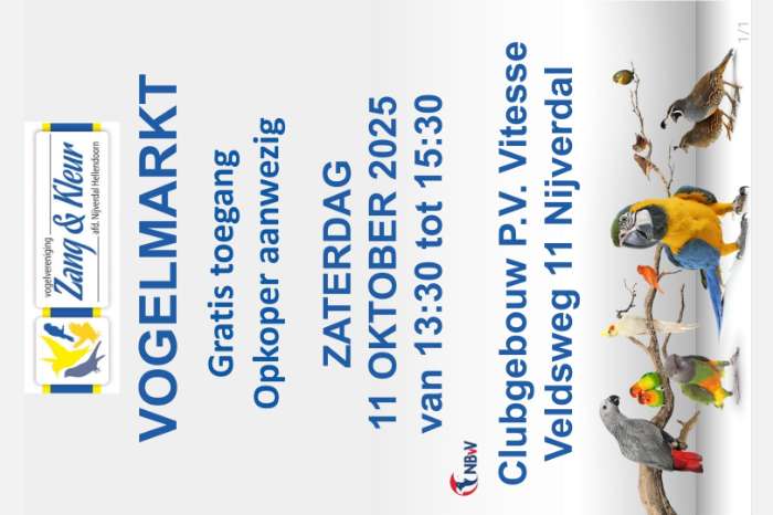 Zaterdag 11 oktober vogelmarkt in nijverdal bij vitesse veldsweg 11van 13,30 tot 15,30 Je mag ook zelf vogels verkopen niet meer dan twee vogels in een tt kooi Voorzien van water en voer Geen lopers en kwartels INTREE IS GRATIS OPKOPER AANWEZIG