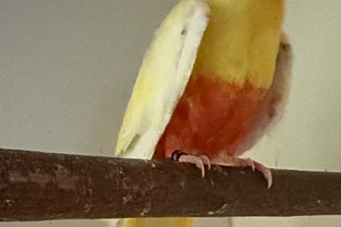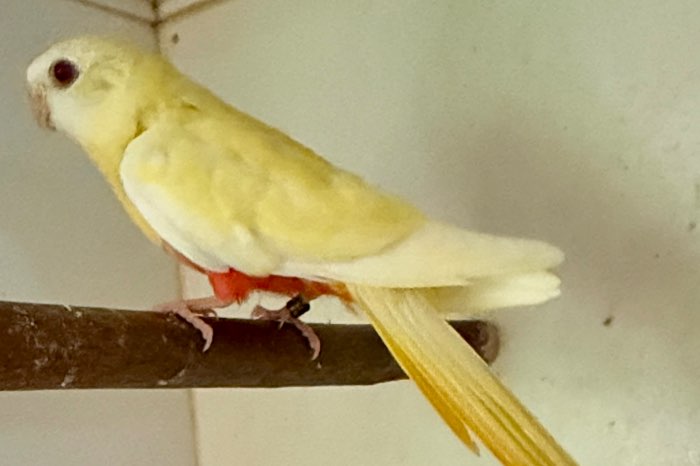 Betreft een eigen kweek roodbuik Lutino pop van voorjaar