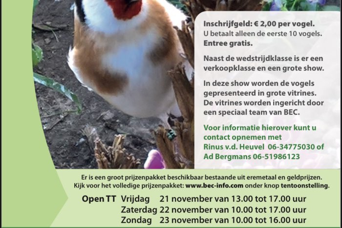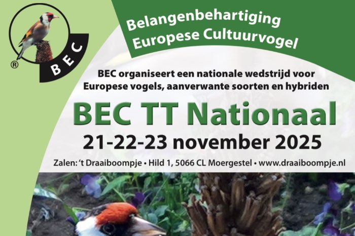 B.E.C. organiseert het Nationaal kampioenschap voor Europese vogels, hun aanverwanten soorten en hybriden, waarvan minstens één ouder behoort tot de bovengenoemde soorten. Tijdens de TT is er ook een verkoopklasse, de openingtijden daarvan zijn gelijk aan die van de TT. Inschrijfformulieren voor de TT en verkoopklasse vindt u in BEC-info 4 en op de website. De inschrijfkosten zijn €2,- per vogel, speelt u met meer dan 10 vogels mee dat betaald u alleen voor de 1e 10, de catalogus is gratis voor deelnemers aan de wedstrijd. U betaalt dus maximaal €20,- als deelnemer. Iedereen die lid is van een bij C.O.M. Nederland aangesloten vereniging is van harte welkom om met zijn of haar vogels mee te spelen voor dit kampioenschap. Meer informatie kunt u vinden in het reglement. Inschrijven kan t/m 10 november. Inschrijfformulier: (link naar website) Reglement: (link naar website) Vraagprogramma: (link naar website)