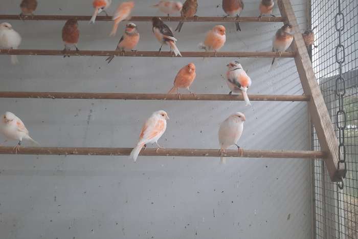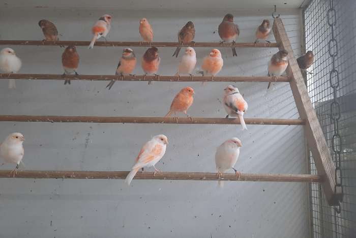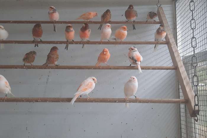 Mooie rood bonte kanaries uit grote voiliere. Jonge vogels van harlekijnen. Goed geringde sterke vogels.