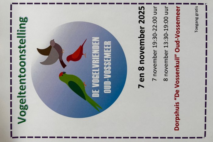 7 en 8 november 2025 organiseert vogelvereniging De Vogelvrienden te Oud Vossemeer een vogeltentoonstelling in dorpshuis De Vossenkuil.