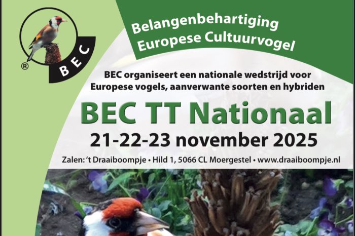 B.E.C. organiseert het Nationaal kampioenschap voor Europese vogels, hun aanverwanten soorten en hybriden, waarvan minstens één ouder behoort tot de bovengenoemde soorten. Tijdens de TT is er ook een verkoopklasse, de openingtijden daarvan zijn gelijk aan die van de TT. Inschrijfformulieren voor de TT en verkoopklasse vindt u in BEC-info 4 en op de website. De inschrijfkosten zijn €2,- per vogel, speelt u met meer dan 10 vogels mee dat betaald u alleen voor de 1e 10, de catalogus is gratis voor deelnemers aan de wedstrijd. U betaalt dus maximaal €20,- als deelnemer. Iedereen die lid is van een bij C.O.M. Nederland aangesloten vereniging is van harte welkom om met zijn of haar vogels mee te spelen voor dit kampioenschap. Meer informatie kunt u vinden in het reglement. Inschrijven kan t/m 10 november. Inschrijfformulier: (link naar website) Reglement: (link naar website) Vraagprogramma: (link naar website)