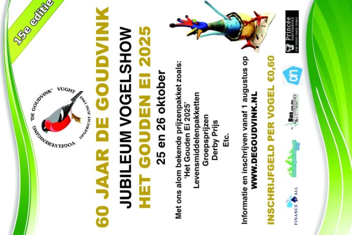 Inschrijfgeld €0,60! U kunt inschrijven tot 12 oktober (is verlengd) De Goudvink Vught, sinds 1965 dit jaar 60 jaar, het vrolijkste gefluit van Brabant en nog lang niet uitgezongen. Wat begon met een paar vogelliefhebbers in 1965 is inmiddels een bonte vereniging van fluitende veren, passie en een kleurrijke vogelshow. Vogelshow Het Gouden Ei organiseren we dit jaar voor de 15e keer, alweer een jubileum. Dat vieren we niet met een piep, maar met een knal: De feestelijke jubileumshow Het Gouden Ei 2025 op 25 en 26 oktober. Wie jarig is, trakteert - deelname kost maar €0,60 per vogel. Dat is geen typefout, maar een knipoog naar onze 60 lentes jong. Eén cent voor elk jaar liefde voor de vogels. Waar? Groencentrum Van der Bruggen, Sint Michielsgestelseweg 5a in Vught, tussen het groen én het gefluit. Kijk nu op www.degoudvink.nl voor reglement en inschrijfformulier, en doe mee. Of je nu een ervaren liefhebber bent, een nieuwkomer met verenkoorts of gewoon dol op mooie vogels: deze editie wil je niet missen. De Goudvink 60 jaar jong!