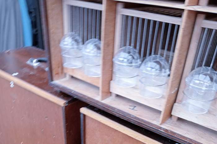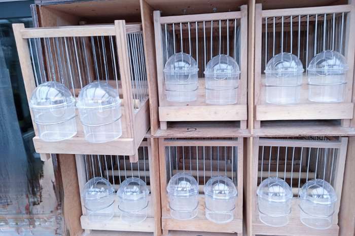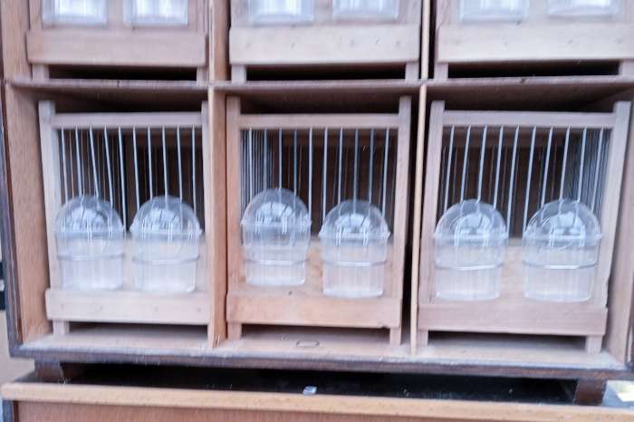 3 Mooie kisten voor het transport van Timbrados, waterslagers ed Ook met totaal 6 kooitjes per kist. Verder wat losse kooitjes