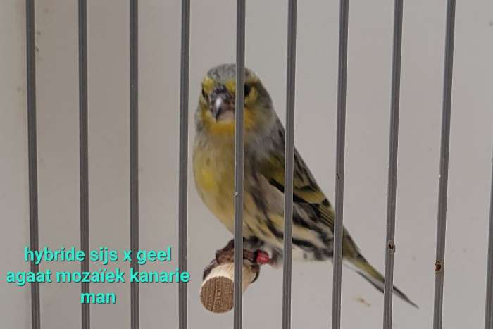 2 mooie hybriden wildkleur sijs man x geel agaat mozaïek kanariepop, ééntje uit 2024 en ééntje uit 2025.