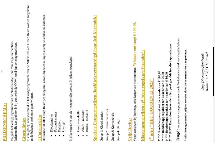 Inschrijfgeld €0,60! U kunt nog steeds inschrijven tot 12 oktober! De Goudvink Vught, sinds 1965 dit jaar 60 jaar, het vrolijkste gefluit van Brabant en nog lang niet uitgezongen. Wat begon met een paar vogelliefhebbers in 1965 is inmiddels een bonte vereniging van fluitende veren, passie en een kleurrijke vogelshow. Vogelshow Het Gouden Ei organiseren we dit jaar voor de 15e keer, alweer een jubileum. Dat vieren we niet met een piep, maar met een knal: De feestelijke jubileumshow Het Gouden Ei 2025 op 25 en 26 oktober. Wie jarig is, trakteert - deelname kost maar €0,60 per vogel. Dat is geen typefout, maar een knipoog naar onze 60 lentes jong. Eén cent voor elk jaar liefde voor de vogels. Waar? Groencentrum Van der Bruggen, Sint Michielsgestelseweg 5a in Vught, tussen het groen én het gefluit. Kijk nu op www.degoudvink.nl voor reglement en inschrijfformulier, en doe mee. Of je nu een ervaren liefhebber bent, een nieuwkomer met verenkoorts of gewoon dol op mooie vogels: deze editie wil je niet missen. De Goudvink 60 jaar jong!