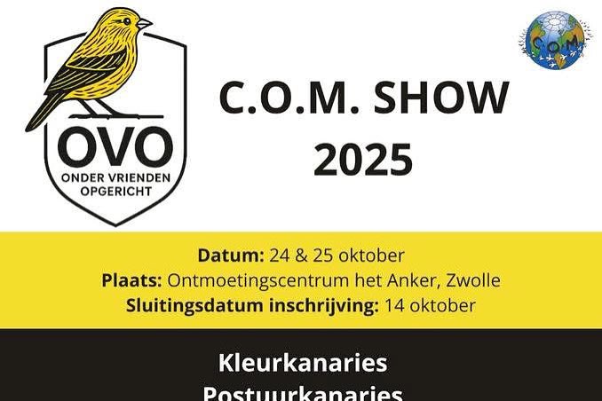 Dé COM show waar je bij wilt zijn. Cultuurvogels , hybride en aanverwanten welkom bij onze prachtige show. Kijk op www.kanarievereniging-ovo.nl voor informatie en inschrijfformulier + vraagprogramma!
