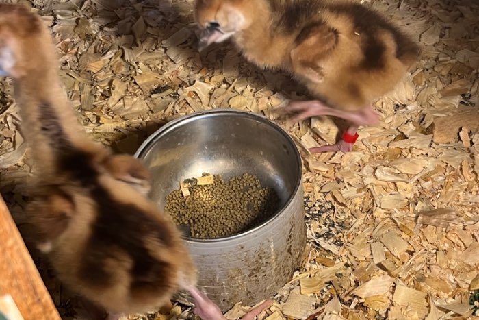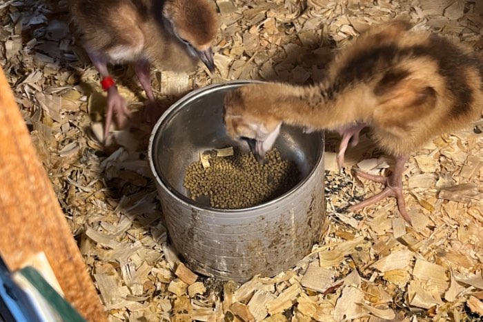2 kuikens van 10 dagen van de grijze kroonkraanvogel