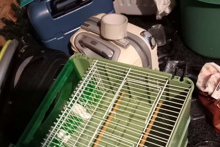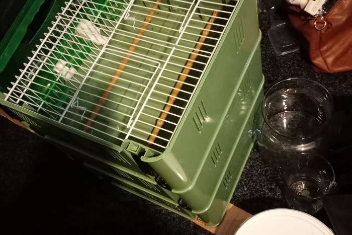 Te koop twee Italiaanse Tino ver voer kooien met een deksel zo goed als nieuw een keer gebruikt om vogels te halen in iItaliƫ ik vraag er voor 70 euro