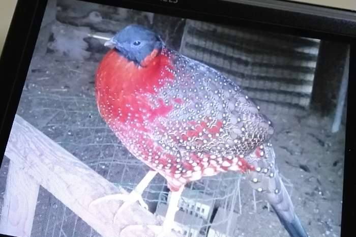 3 jonge satyr tragopanen 2025. Foto 1, 2, 3 zijn van de jongen en foto 4 van de vader. Natuurbroed, vliegend en ontwormd. 2 hanen en 1 hen, allemaal met rechte tenen. Prijs: 125 euro/haan of 250 euro/koppel of 350 euro voor alle 3.