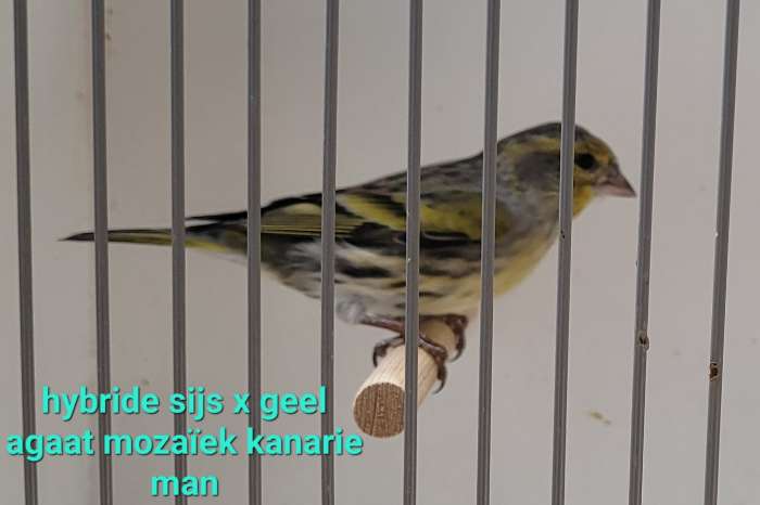 2 mooie hybriden wildkleur sijs man x geel agaat mozaïek kanariepop, ééntje uit 2024 en ééntje uit 2025.
