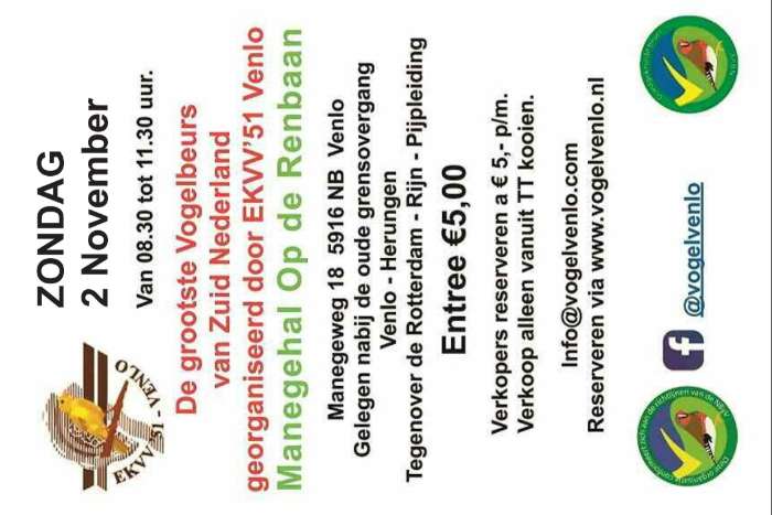 Op 2 november a.s. organiseert EKVV'51 uit Venlo wederom een grote internationale vogelbeurs. De beurs wordt gehouden in de manegehal Op de Renbaan, Manegeweg 18, 5916NB (nabij de grensovergang Venlo-Herungen, tegenover Rotterdam - Rijn- Pijpleiding). Op de beurs zullen diverse vogelverkopers aanwezig zijn alsmede verkopers van diverse vogelbenodigdheden. Entree voor de beurs is 5 Euro. Openingstijden: 8.30 - 11.30. Verkopers kunnen reserveren via de website van EKVV'51 ((link naar website)). Info via info@vogelvenlo.com.