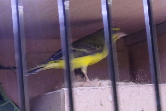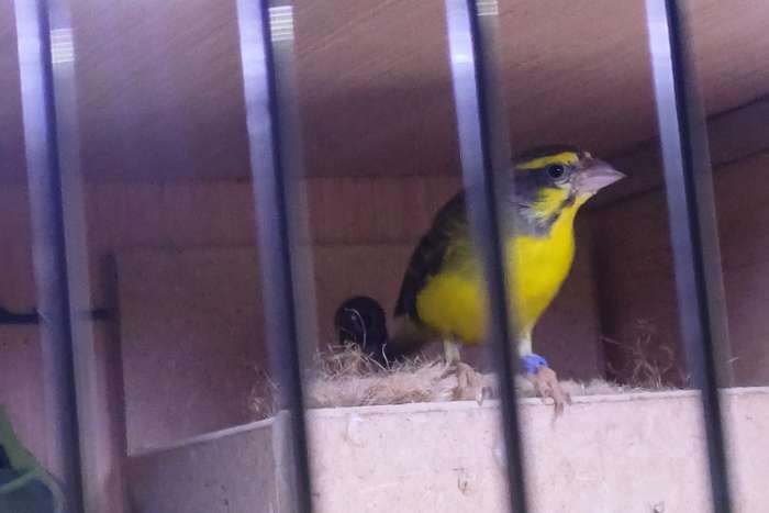 Mooi mozambiquesijs man geringd 2023 , vogel zit strak in de veren en fluit volop. Hij zit in een onverwarmde garage.