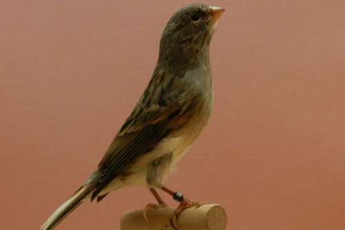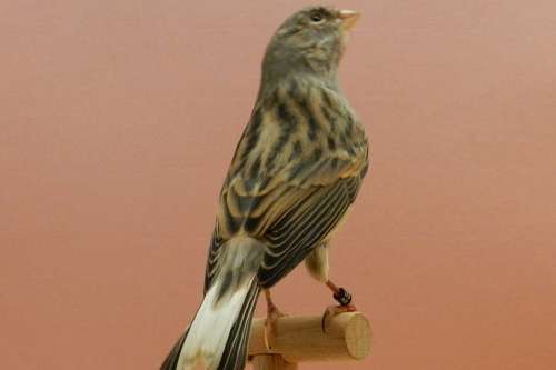 Kanarie van 2025, zwart wit dominant met enkele witte staartpennen. Geslacht nog onbekend, maar aan het postuur te zien denk ik dat het een man zal zijn.