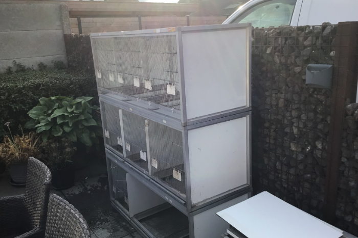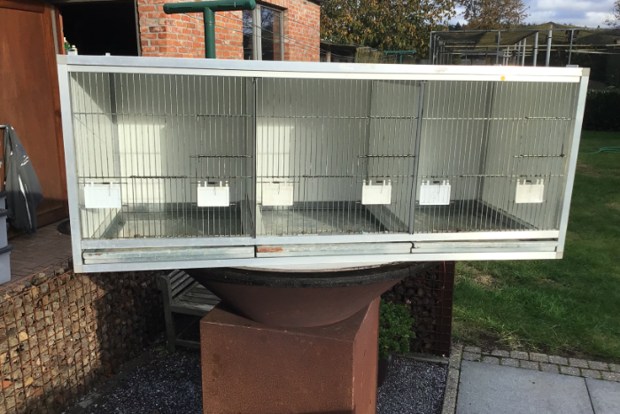 Zes kweekkooien met uitneembare tussenwanden. Volledig afwasbaar en waterbestendig met alle toebehoren zitstokken eet en drinkflesjes nesten eivoerbakjes enz enz in goede staat ook