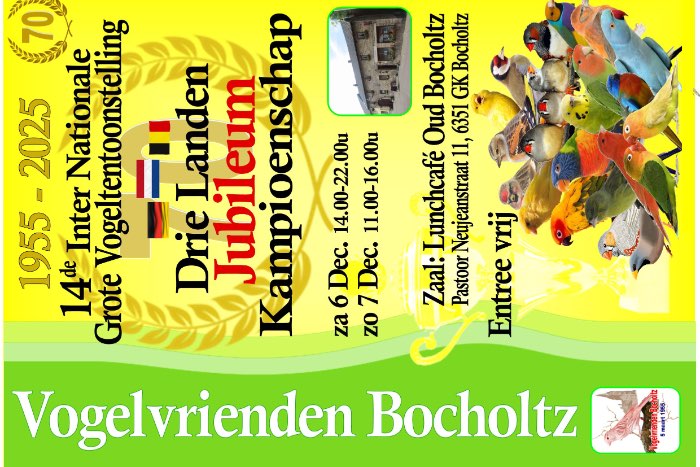 De Vogelvrienden Bocholtz organiseert haar 70 jarige jubileum tentoonstelling. Zaterdag 6 en Zondag 7 december 2025.