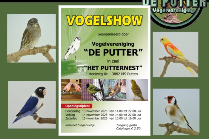 Vogelvereniging “De Putter” houd haar jaarlijkse vogelshow op 13 tot en met 15 november de jaarlijkse vogelshow.