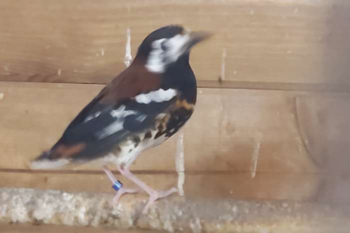 1 Kastanjerug lijster - Zoothera dohertyi ( man met DNA , doorgezaagde ring 2022 ) Zit in de buitenvoliere , gaat weg wegens overlijden van de pop Vaste prijs € 200,-