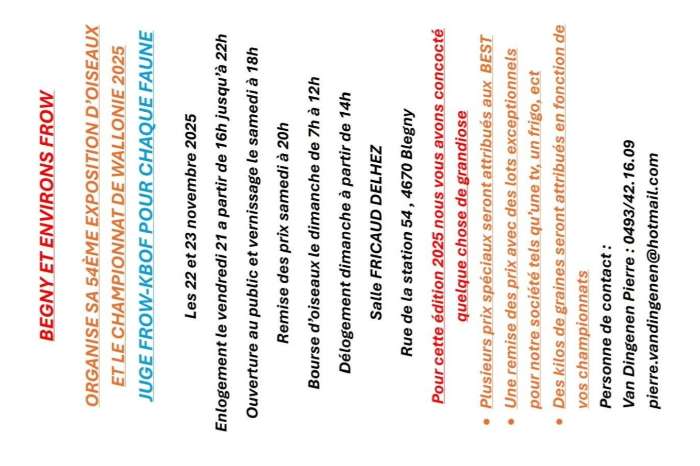 Bonjour ! L'unique Championnat de Wallonie 2025 à Blegny. Ouvert à tous, toutes nationalités et tous pays. Juge KBOF dans chaque faune Une magnifique table de prix avec télévision, réfrigérateurs, etc. Le nombre de kilos de graines varie selon le championnat. 15 Prix spéciaux pour les meilleurs oiseaux de chaque faune. 3 best in show Exposition exceptionnelle n'attendez plus a vous inscrire