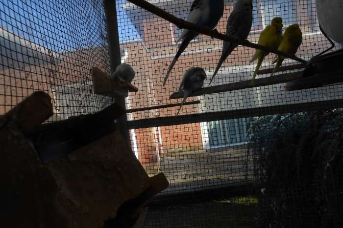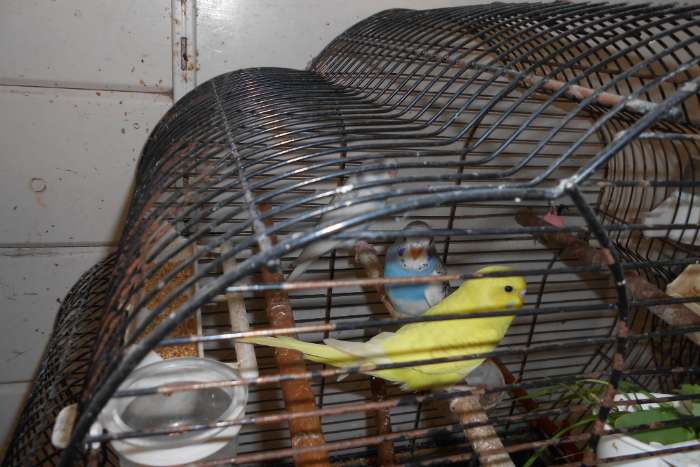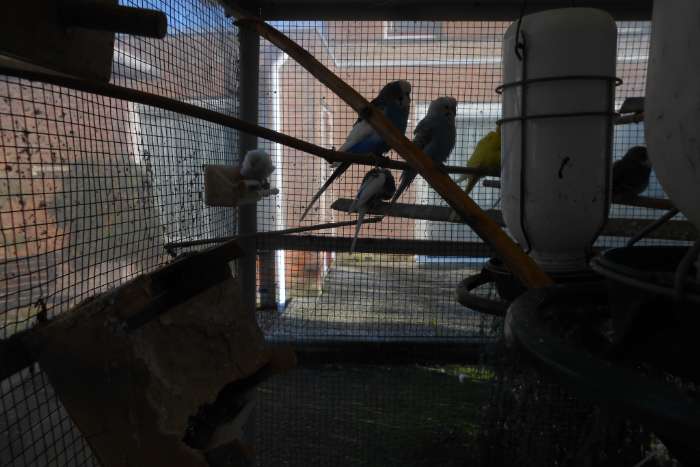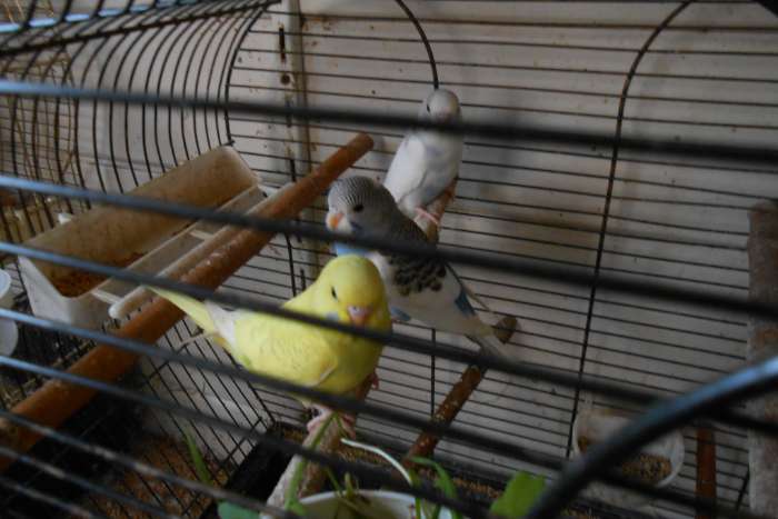 De foto's van de alhier getoonde jonge parkietjes zijn zojuist gemaakt.Alle jongen zijn in de buitenvoliere geboren en vandaag zijn er drie uitgehaald en in een kooitje gezet.
