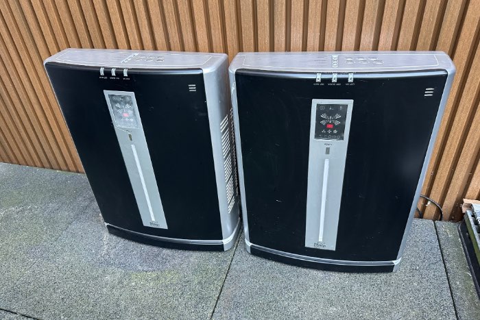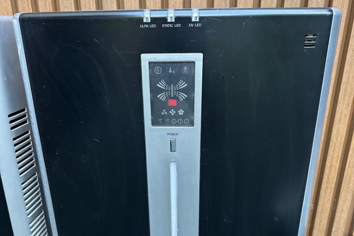 Twee Progenion luchtreinigers, ideaal voor gebruik in vogelverblijven. Deze luchtreinigers helpen de lucht schoon en fris te houden, wat essentieel is voor de gezondheid van uw vogels. Ze zijn effectief in het verwijderen van stof, veren, en andere allergenen uit de lucht.