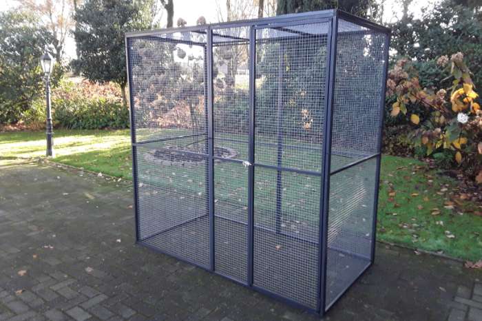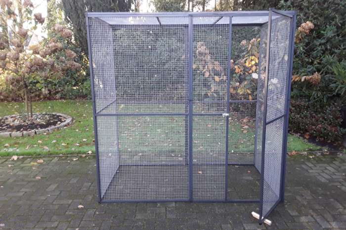 Aangeboden mooie volière aluminium onderhoudsvrij met dik gaas met mazen van 19x19x1.45 als nieuw . Bestaat uit 7 losse panelen is gedemonteerd. Grijs antraciet afmeting is L 204 B107 H 200