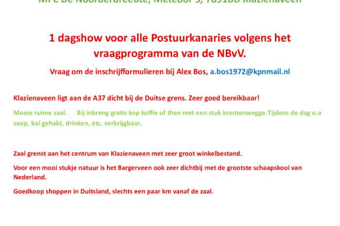 Het belooft weer een show te worden met top kwaliteit postuurkanaries. Meerdere winnaars van medailes op NK en WK's hebben reeds ingeschreven.