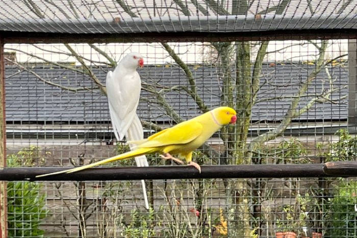 Mooi koppel overjarige Halsbandparkieten. Man is ino- pallid/ blauw van 2022 en de pop albino ( eigen kweek) van 2018. Goede forse vogels in prima conditie.