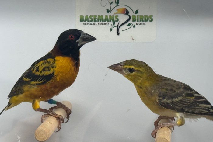 1-1 Grote textorwever (Ploceus cucullatus) 2024 3-4 Fluweelwever (Ploceus nigerrimus) 2024, 2025 2-2 Roodkopwever (Quelea erythrops) 2024, 2025 3-3 Vlammenwever (Euplectes hordeaceus) 2024, 2025 Nakweek vogels, de meeste zijn vast geringd. Inruil mij passende vogels mogelijk, wij zijn iedere zaterdag geopend van 09.30 tot 17.00. Altijd variƫrende voorraad in vogels. Kreitenstraat 20 5061PT Oisterwijk +31633881899 Alle vogels voldoen aan de huidige wetgeving. Wij zijn in het bezit van een vakbekwaamheid diploma. Ubn nummer 6488080