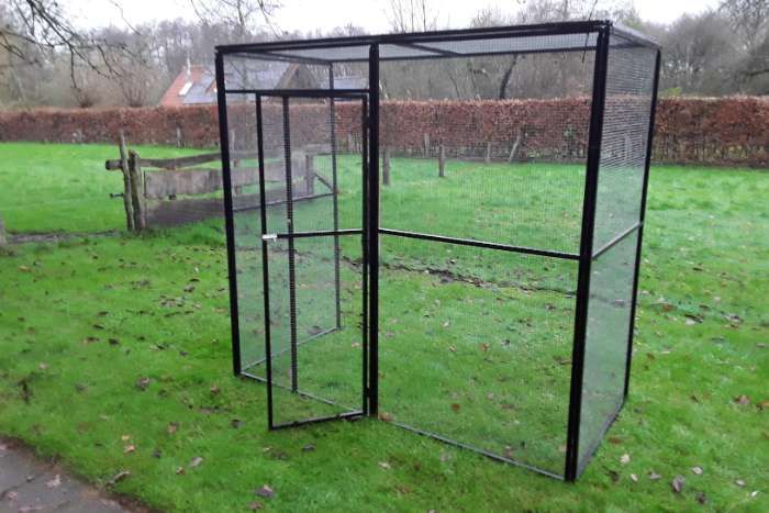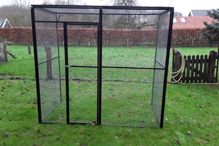 Aangeboden mooie volière aluminium onderhoudsvrij gaas met mazen van 12x12 . Zwart koker profiel 20x20 . Open achterkant moet tegen een wand of muur geplaatst worden Afmeting 205 lang 98 breed 187 hoog . Wordt geleverd met bevestiging schroeven . Kan ook geleverd worden met dichte achterkant met acp platen in flens op koker profiel tegen meer prijs Prijs 175 euro Mvg Gerrit