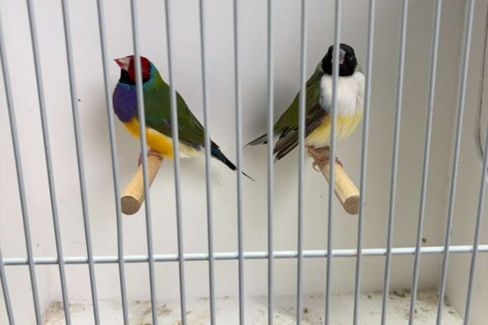 Vier koppels gouldamadines die mogen verhuizen. 1 Man: roodkop paarsborst pop zwartkop paarsborst. 2 Man: zwartkop paarsborst pop zwartkop witborst. 3 Man :roodkop paarsborst pop zwartkop witborst. 4 Man:roodkop Paarsborst pop roodkop wit borst.