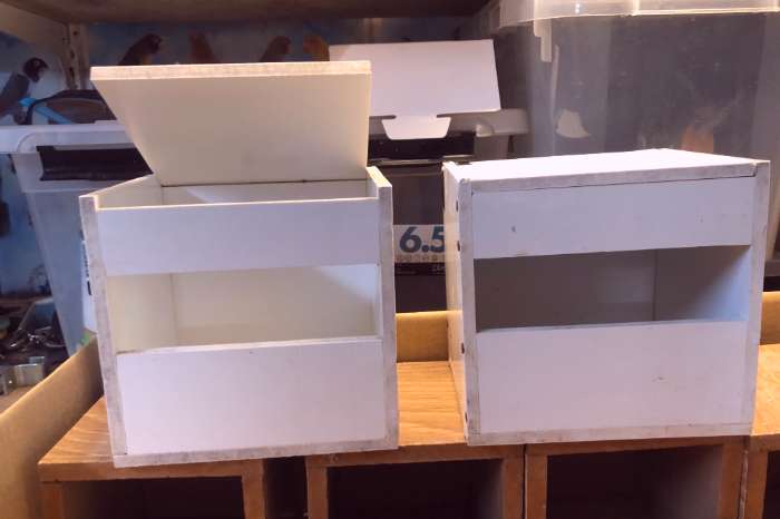 Doos 1 Div vogelnestjes 12 stuks Parket hout plus minus 10,5x10,5 2x wit nestkastje 13x13 hoekje los is gelijmd plus minus 13x13 2x fauna beige Euro 25 plus minus 10 bx13,5 h totaal 16 items 1 volle doos