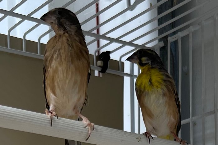Twee koppels Citroenborst Edelzangers te koop. 2024/2025. Vogels zitten in de garage op 10 graden.