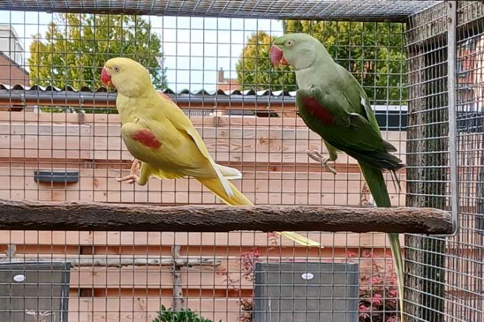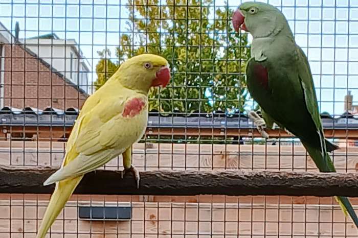 Onverwant koppel alexanders. Recessiefgrijsgroen/lutino x Lutino. Man 2024 Pop 2025