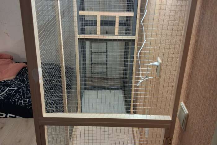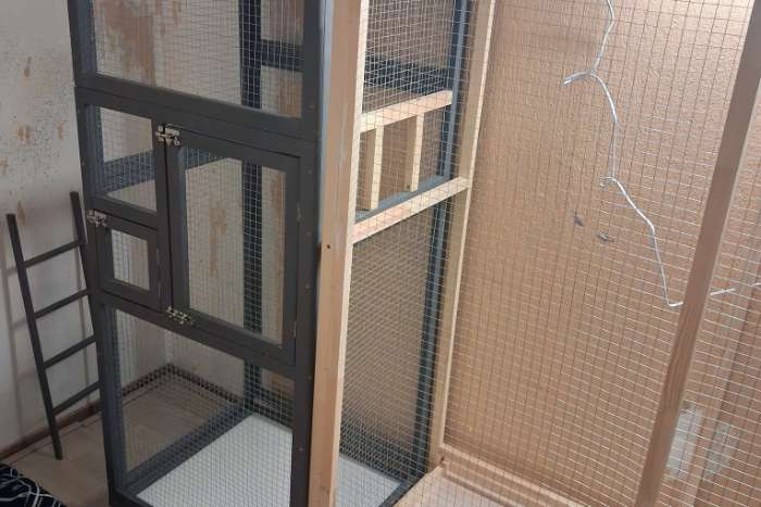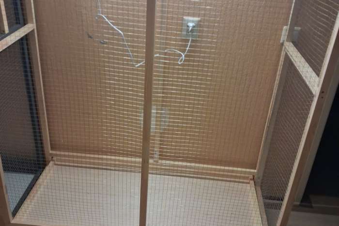 Nieuwe volière 68x63x165 en een zelf gebouwde 123 lange aan bouw moet afgebouwd worden geraamte met gaas zit er op grote gemaakte lade de achter kant moet u nog dicht maken en ook de bovenkant zit led verlichting in alle hout is nieuw er zit een opening in de andere zo dat ze van de ene naar de andere kunnen gaan plus stokken prijs voor alles € 200,00