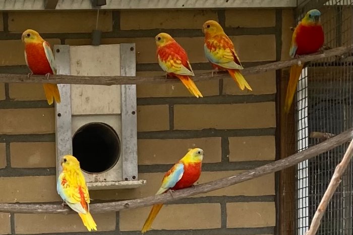 Turquoisine gele roodbuik mannen en popjes van 2025 zijn geringd geen koppels vogels zijn verwant