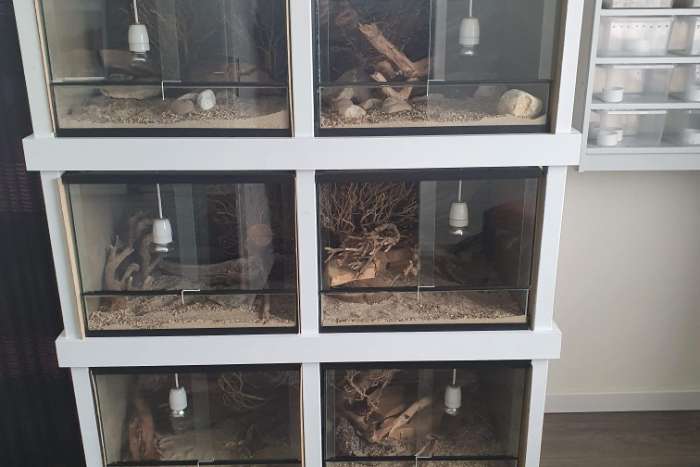 Deze prachtige opstelling terraria 6stuks 52x52x42 hoog, incl. inrichting heb hier altijd met succes kleine dwerg Bites soorten in gekweekt. Incl. verlichting, kan zo starten met de hobby .