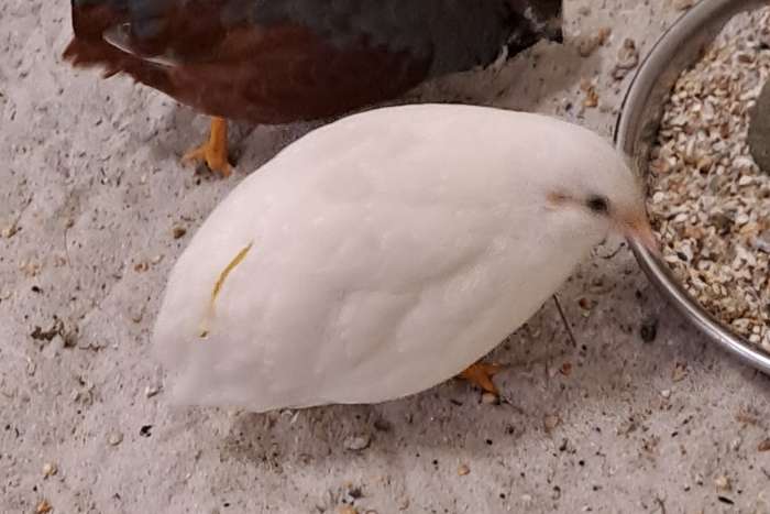 Een witte Chinese dwergkwartel, natuurbroed uit 2025 (weet het niet helemaal zeker maar ik denk een haantje).