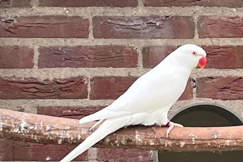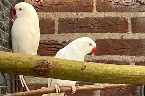 Prachtig koppel Albino Halsbandparkieten, onverwant, man en pop uit 2021, eigen kweek. Broedrijp.