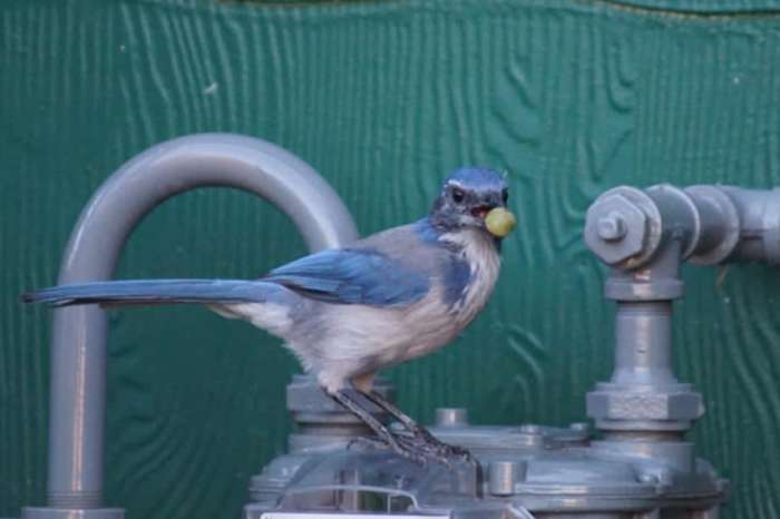 Aphelocoma californica Ganz intelligent a spilleresch Vugel. Kann de ganzen Dag iwwer gespillt ginn.