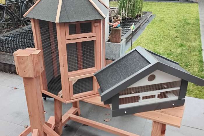 Supper mooie kooien 6hoek van Douglas hout kan zo buiten staan Bodem 60cm doorsnee 100hoog zit stok 16mm boven in om te schuilen Robuuste zwaare standaard 6hoek €190 Compleet met standaard €235 Evt met zwenkwielen gemonteerd €10 Geschilderende kooien Zie foto's en alle advertenties Info graag bellen 06 12287054 of WhatsApp