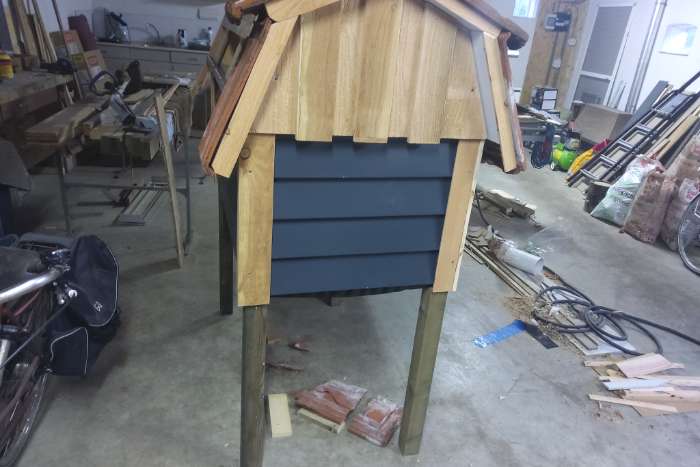 Kippenhok buitenzijde antraciet rabbat / potdekselplaten ( metaal ) afgewerkt met douglas houten omlijsting Het legnest is uitschuifbaar en in het mansarde dak verwerkt. Foto 3 De kippen kunnen via de bodem na binnen foto 6 rechts De grootste maten (van de pannen zijn ) Totale hoogte =1750 mm Totale breedte = 1500 mm Totale diepte = 950 mm De maten van het hok zijn Hoogte = 900 mm Breedte = 1260 mm Diepte = 720 mm Op de nok ligt nog niet wat ,omdat daar meer mogelijkheden zijn nl nokpannen ,lood of een aluminium omgekeerde dakgoot( gevormde nok van blik )