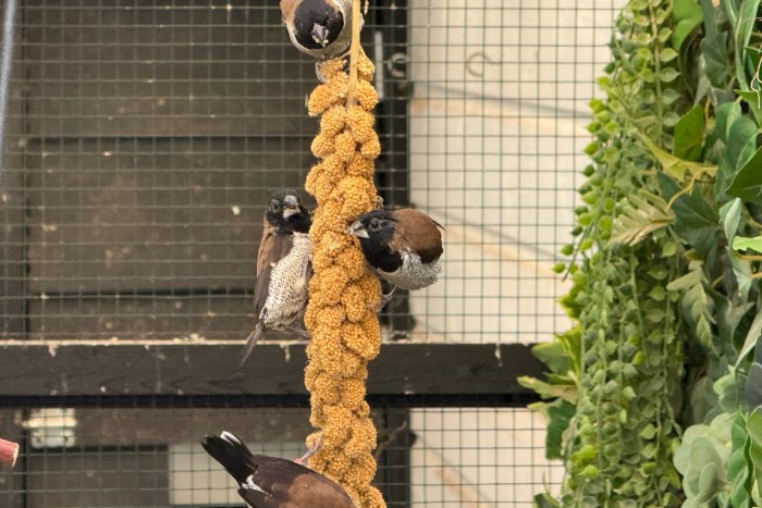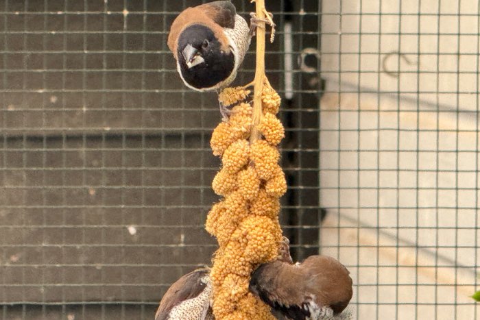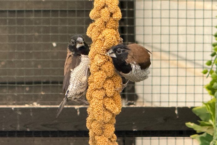 Twee Molukken bronzemannen uit één nest. Van begin najaar. Op kleur. Geslacht onbekend. Zitten in de buitenvoliere.