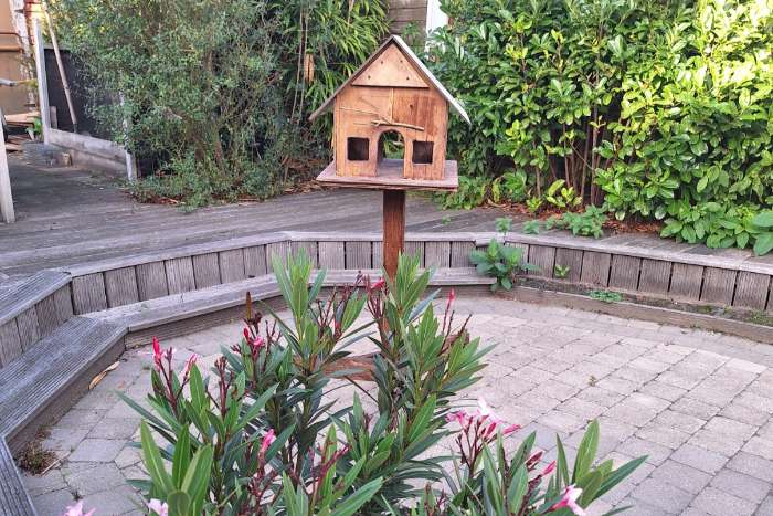 Groot voederhuis met trespa dak en voetsteun behandeld met biocarbonile Nieuw 35€ 0476290308