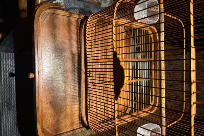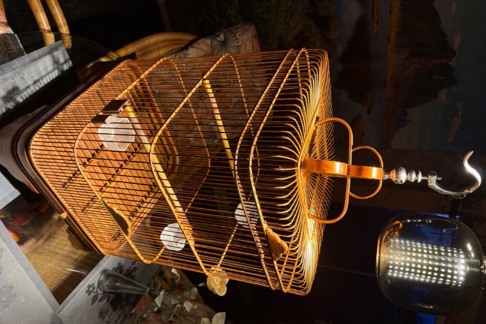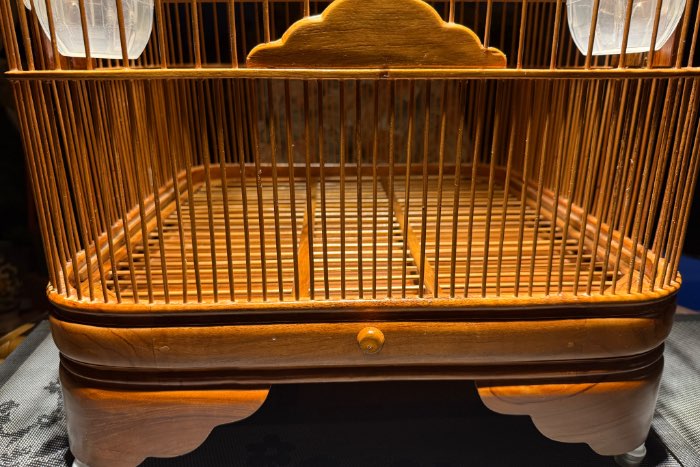 Exclusieve zangkooi zeer geschikt voor b.v. Shama lijster, mooi meubelstuk i.z.g.st. Afmeting 45x45cm hoogte binnenkant kooi 65cm totale hoogte inclusief pootjes, kroon en haak 105cm. De kroon en haak kan gedemonteerd worden.