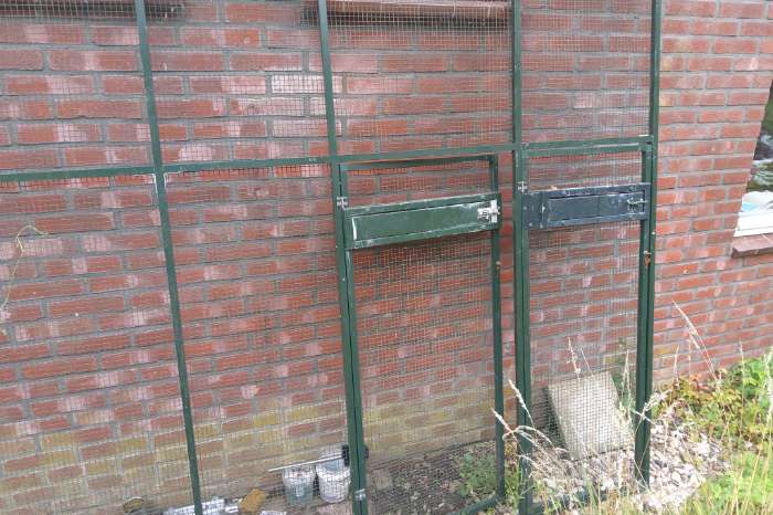 Volière L =2000 x B =2000 x H= 1770 mm ( De echte hoogte wordt bepaald door de fundering) Volière is gebruikt ,het gaas is geplastificeerd. 1 paneel is groter een extra deur voor een volière die er ooit naast stond. De achterzijde bestaat uit 2 geharde glasplaten van 20 mm dik. Het dak bestaat uit een gaaspaneel met daarin geplastificeerd gaas. Er zitten RVS voerbakjes , 2 drinkflessen en nestkastjes bij. Maten panelen 920 x 1770 mm 1040 x 1770 mm 1980 x 1770 mm 2535 x 1770 mm ( dubbele deur )