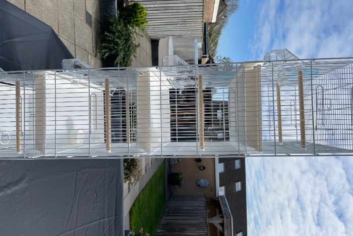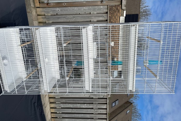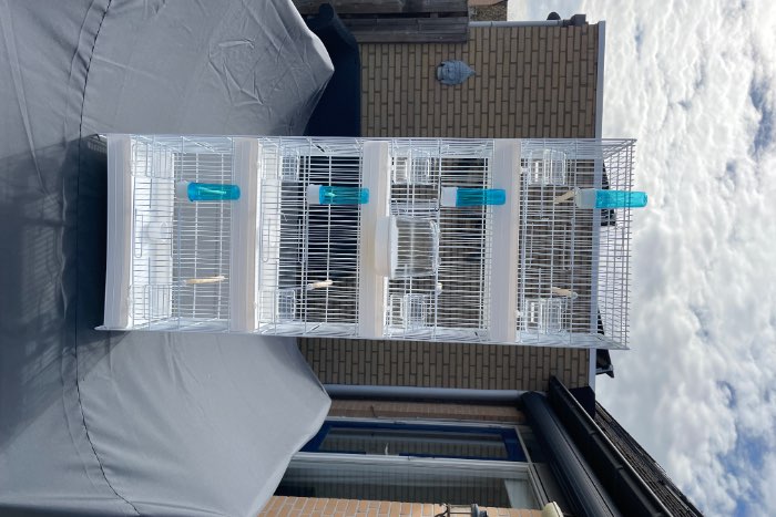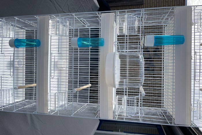 Mooie en degelijke toren kooi 4 etages hoog kleur wit,compleet met zaadbakjes,drinkfonteintjes,badje,ruifjes,eivoer bakjes.