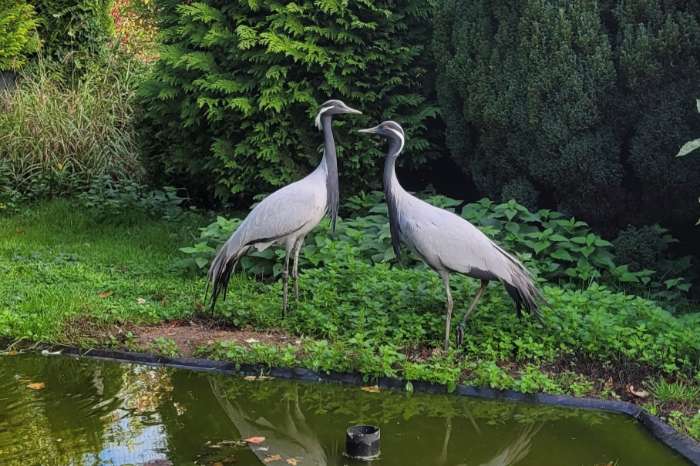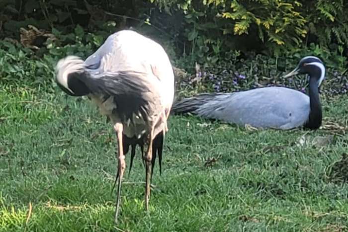 Aangeboden wegens stoppen hobby: Koppel jufferkraanvogels (2013/2014) met DNA, rechte tenen en goed in de veren, met 2 eieren