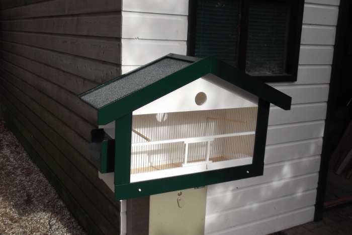 nieuwe lijstermerelkooien geschikt om diverse vogeltje,s in te houden afm kooi 98cm breed met dak overstek nokhoogte 60cm 40cm diep met dak overstek voor zien van schuiflade 3 zitstokken en voer bakje €120,--p,st